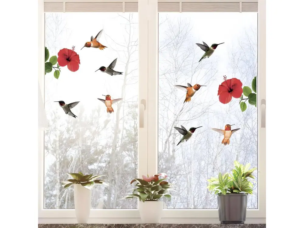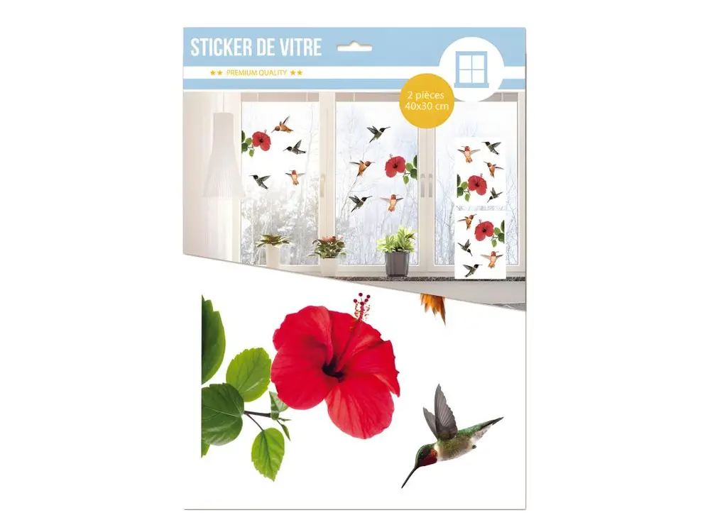 Adhésifs de vitres Hibiscus et colibris A coller sur une surface PARFAITEMENT lisse sèche et lessivée Dim 2 panneaux 40 x 30 cm